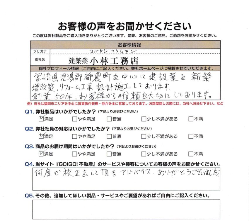 Q. 当サイト『GO!GO!不動産』のサービスや接客についてお客様の声をお聞かせください。