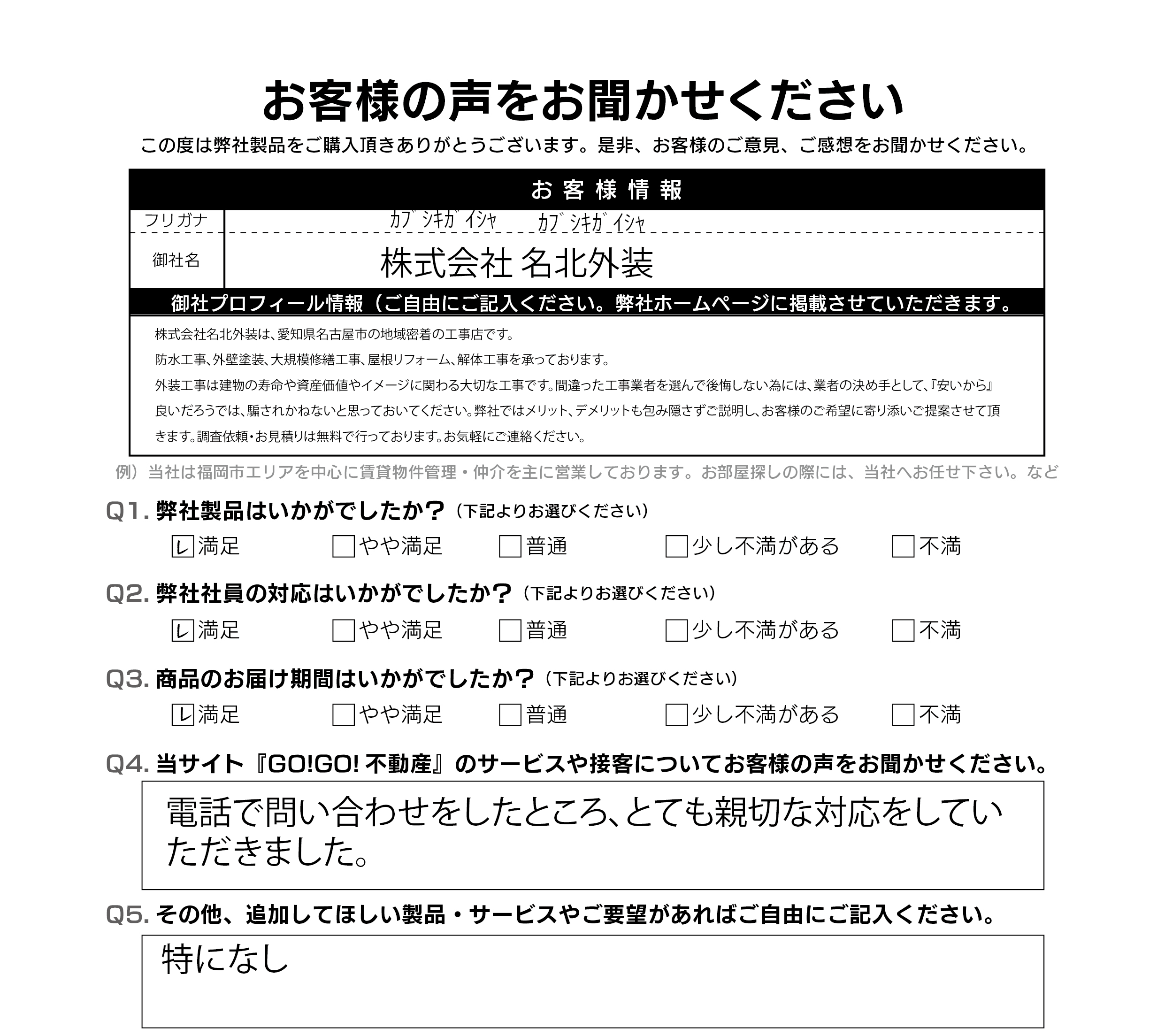 Q. 当サイト『GO!GO!不動産』のサービスや接客についてお客様の声をお聞かせください。