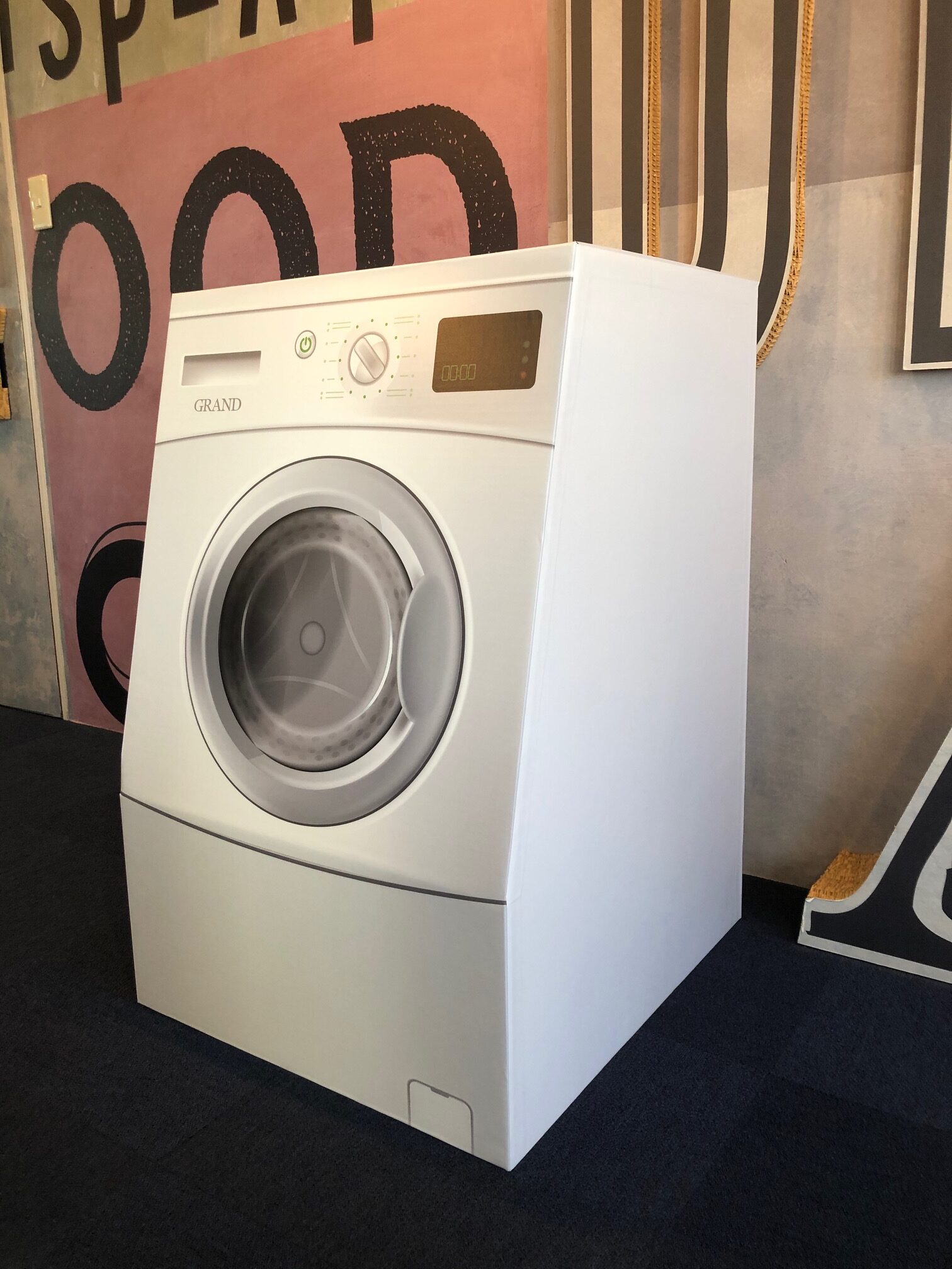 実際の洗濯機に近いサイズ感と立体的なデザインにより、来場者にもリアルな暮らしのイメージを伝えることができます。シンプルながら存在感のある仕上がりで、空間全体の完成度を高める効果が感じられます。